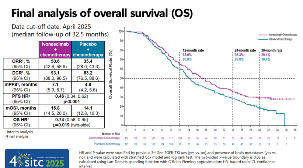 此前,HARMONi-A研究已经在针对PFS的期中分析中取得统计学显著性结果(PFS HR 0.46,P<0.001)。在依沃西治疗EGFR-TKI 耐药NSCLC适应症上市审评中,应监管部门要求,HARMONi-A研究进行了OS的描述性分析。本次针对OS的最终分析则是根据统计分析计划(SAP)进行的序贯检验,这也是HARMONi-A研究最终且唯一计划的OS正式分析。